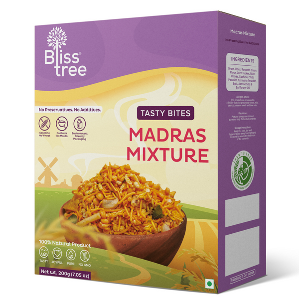 Ingredients: Gram Flour, Roasted Gram Flour, Corn Flakes, Rice Flakes, Cashew, Chilly Powder, Turmeric Poweder, Salt, Asafoetida & Vegetable Oil.