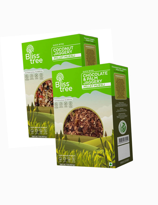 Chocolate & Palm Jaggery Millet Muesli Ingredients: Extruded flakes (Foxtail millet, Pearl millet, Jowar, Quinoa), Amarnath, Rolled Oats, Brown Rice Flakes, Raisins, Virgin Coconut oil, Almonds, Pumpkin seeds, Watermelon seeds, Chai seeds, Flax seeds, Pineapple, Cranberries, Papaya, Pink salt, Chocolate Powder, Choco chips, Honey, Palm Jaggery, Rosemary Extract (Natural Anti-oxidant)
